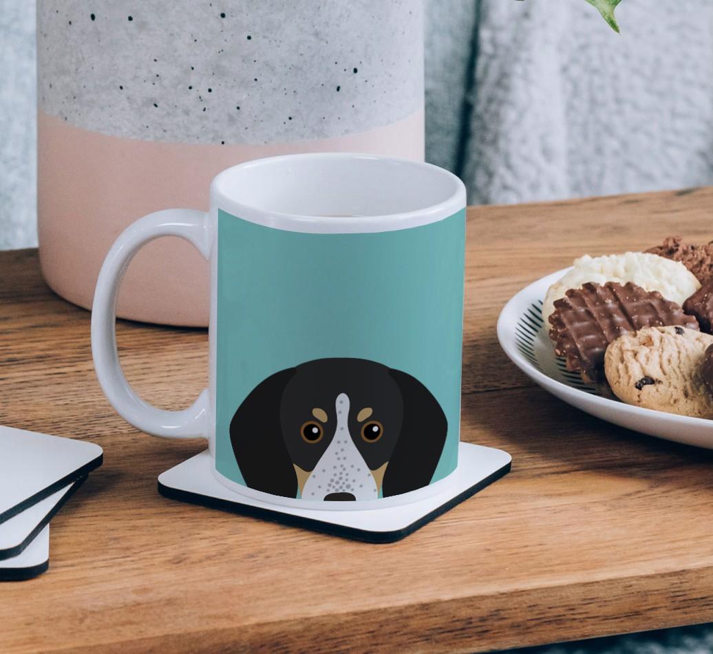 Enjoy the perfect coffee break with a mug that stars your furry friend! Featuring a Yappy.com exclusive Bluetick Coonhound peeking icon, this pawgeous mug will look at home in any dog lover's kitchen and we're pretty sure Bluetick Coonhound will be a fan too.