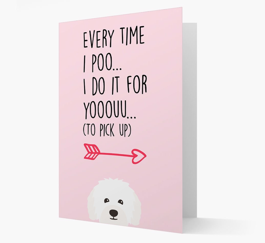 Printed with the words ‘Everytime I poo… I do it for youuuuu (to pick up)’, this lyrical card is personalized with our famous Bolognese icon – so it’s clear who’s been leaving you all those delightful ‘gifts’ to pick up!