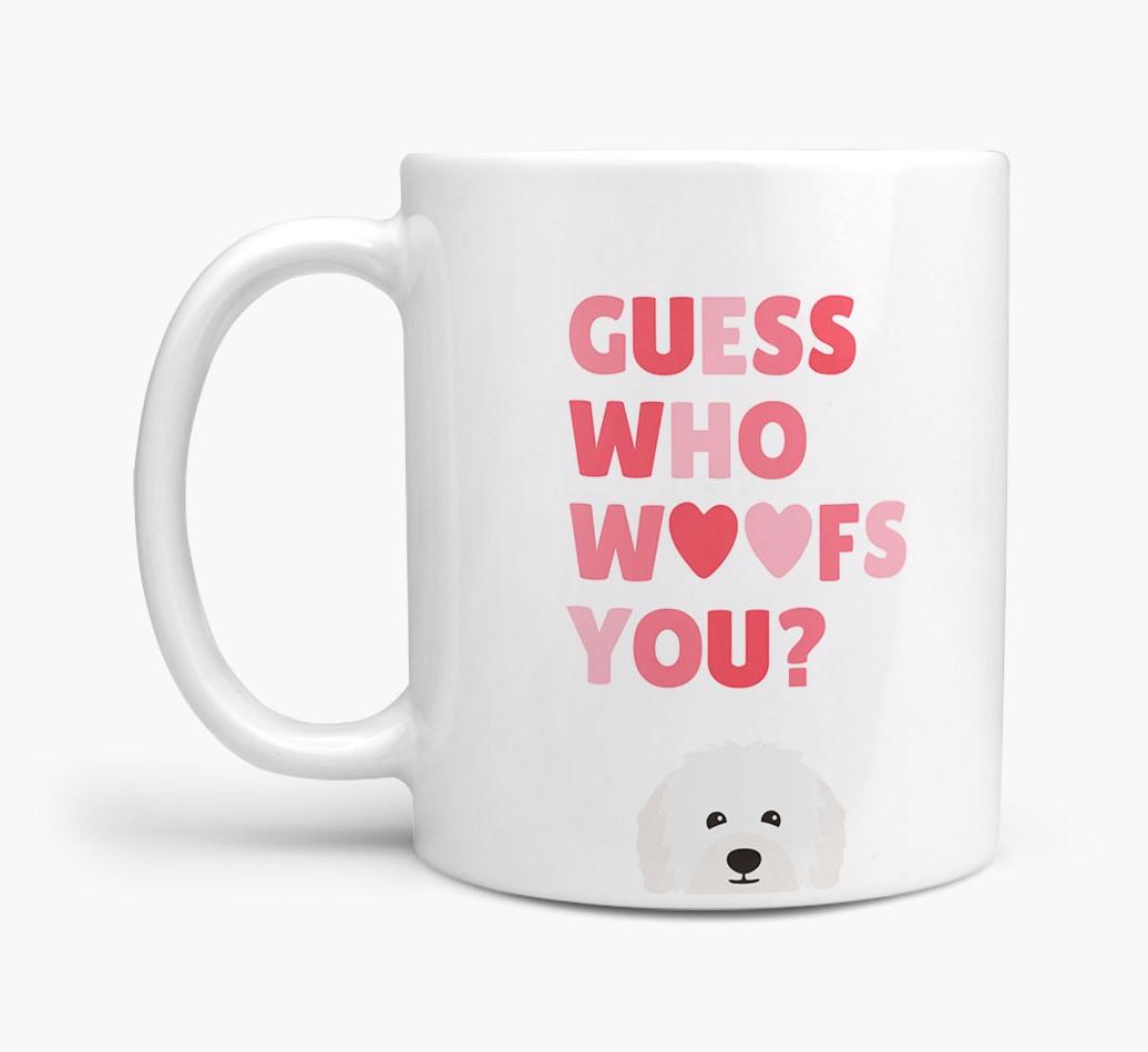Personalized with Bolognese's cute face, this adorable mug is perfect for showing off the one who "woofs" you - how sweet!