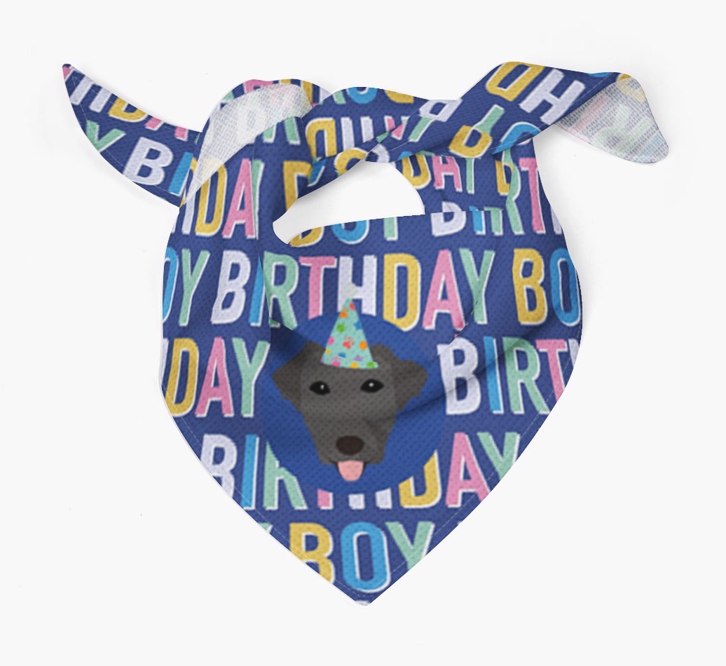 Featuring a colorful text pattern that reads 'birthay boy' and personalized with Borador's cute icon (complete with a fun party hat), your Borador will look simply pawgeous on their special day when they're wearing this bandana.