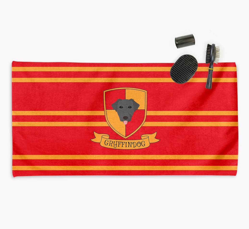 Soft and absorbent, this lightweight towel is perfect for drying off your furry friend in a flash. It features your pup's magical icon and is available in a choice of (dog)house colors. The only question is - does your pup belong in Hufflewoof, Slobberin, Ravenpaw or Gryffindog?