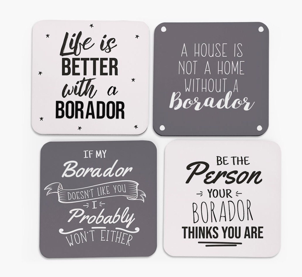 Each coaster has a special unique phrase and shows just how much Borador means to you. They come in five contemporary colors and are the pawfect addition to any stylish Borador lover's home.