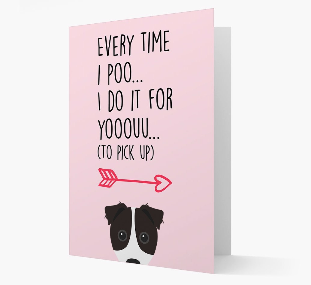 Printed with the words ‘Everytime I poo… I do it for youuuuu (to pick up)’, this lyrical card is personalized with our famous Border Jack icon – so it’s clear who’s been leaving you all those delightful ‘gifts’ to pick up!