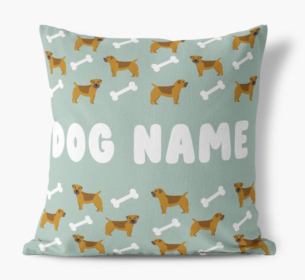 Personalized with Border Terrier’s name against a background of Border Terrier icons and bones, this gorgeous pillow is full of pawsonality.