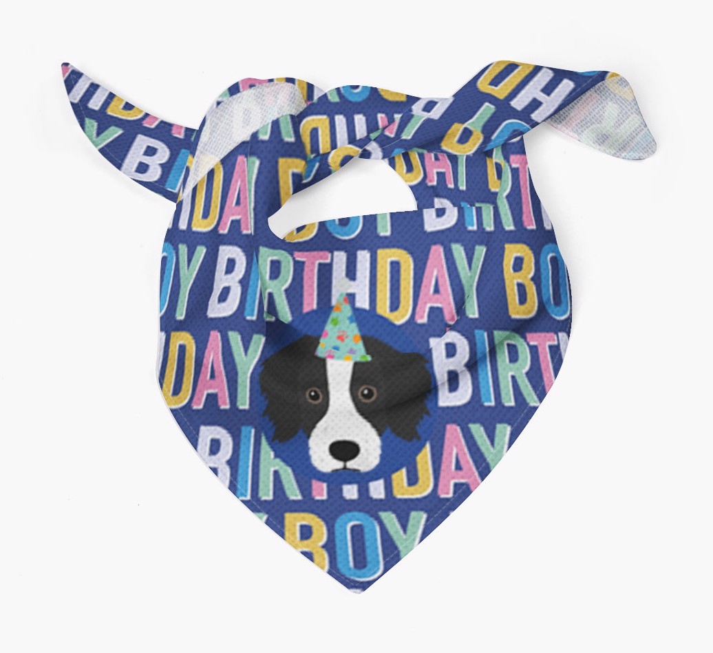 Featuring a colorful text pattern that reads 'birthay boy' and personalized with Bordoodle's cute icon (complete with a fun party hat), your Bordoodle will look simply pawgeous on their special day when they're wearing this bandana.