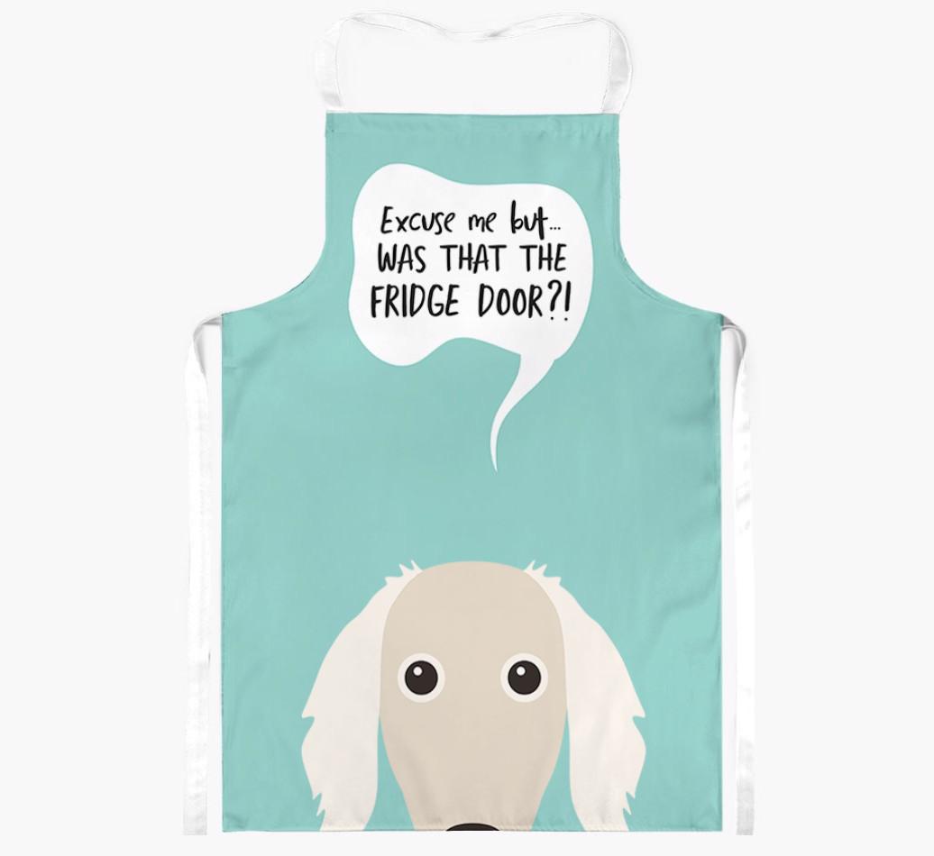 Featuring your hungry hound's cheeky icon and available in five eye-catching colors, this apron is a must-have for parents of greedy pups!