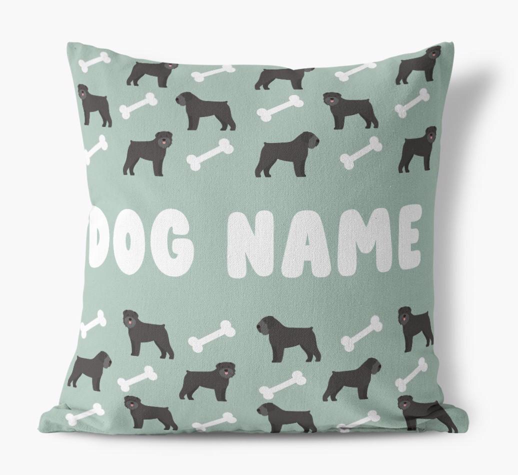 Personalized with Bouvier Des Flandres’s name against a background of Bouvier icons and bones, this gorgeous pillow is full of pawsonality.