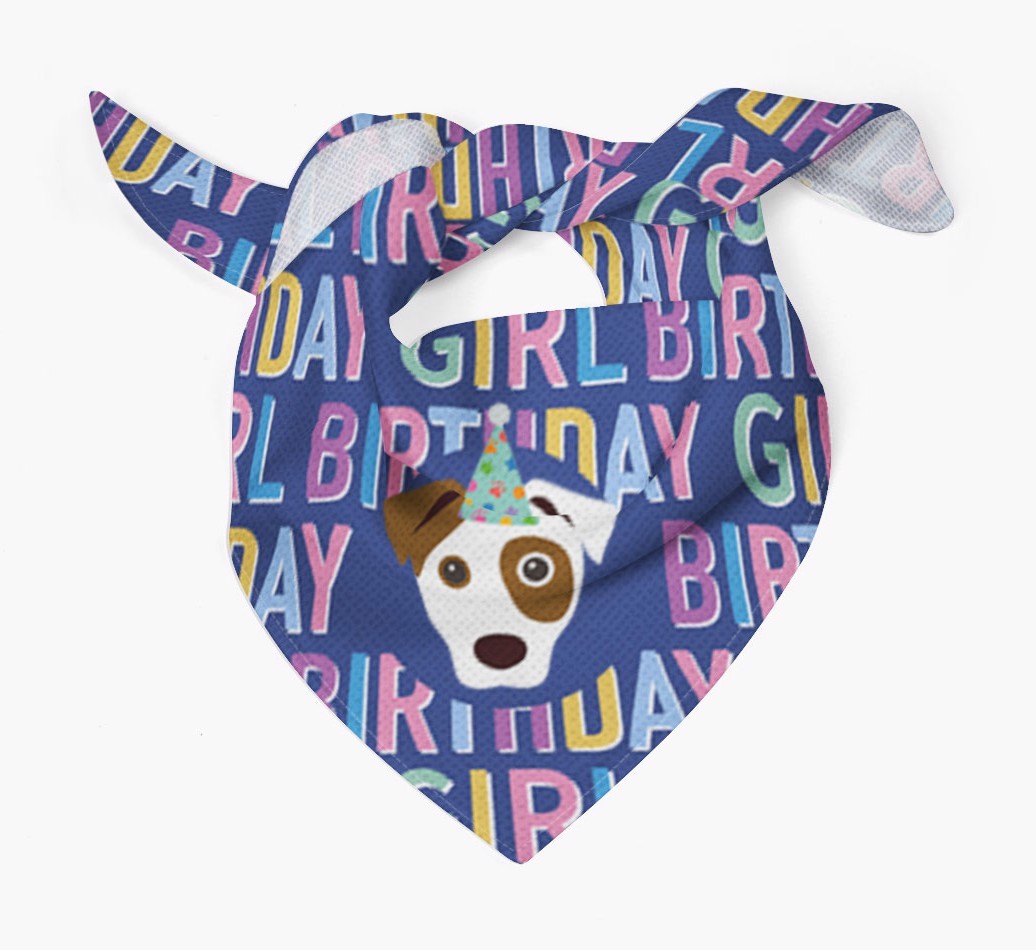 Featuring a text pattern that reads 'birthay girl' and personalized with Boxador's cute icon (complete with a fun party hat), your Boxador will look simply pawgeous on their special day when they're wearing this bandana.