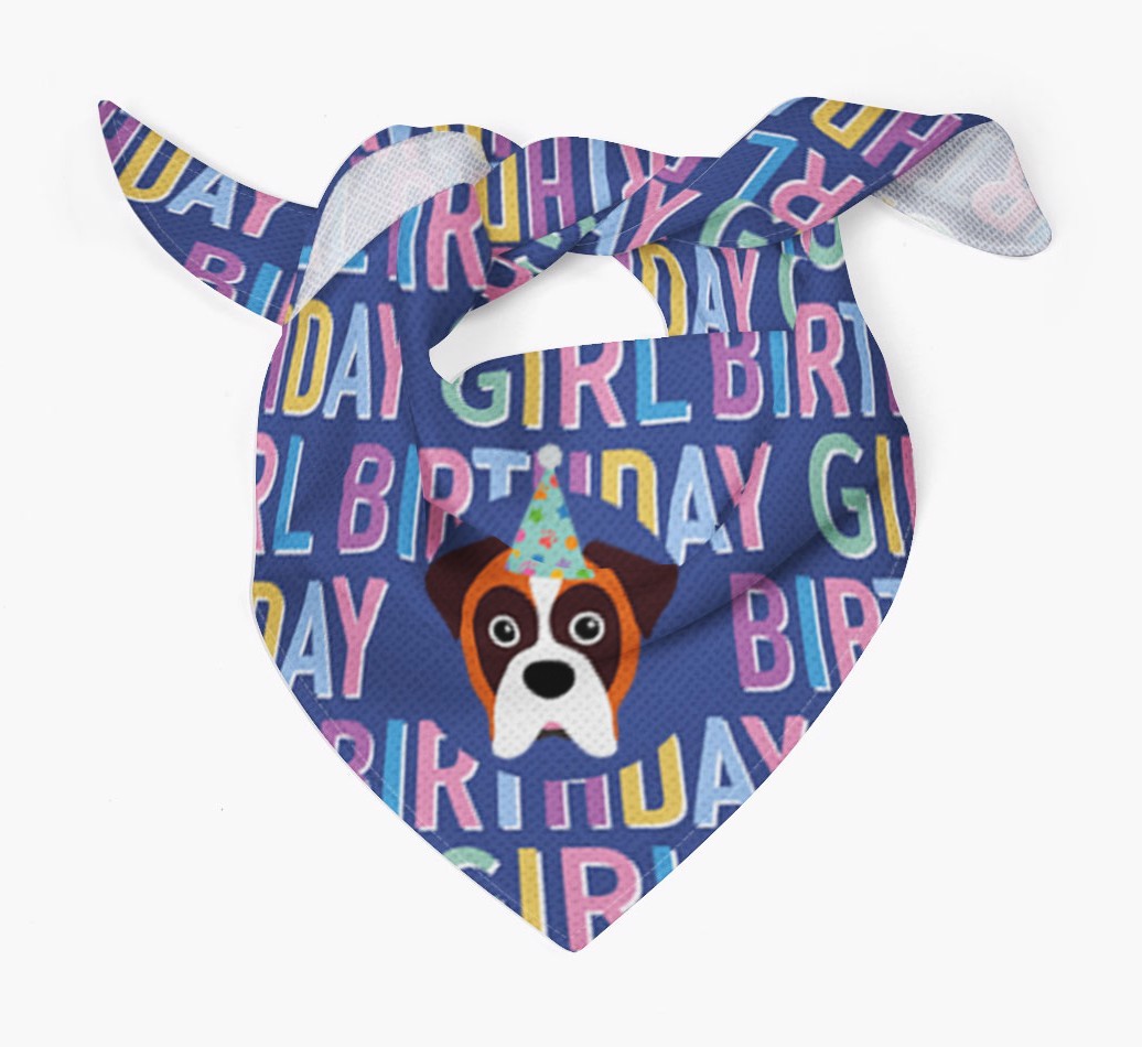 Featuring a text pattern that reads 'birthay girl' and personalized with Boxer's cute icon (complete with a fun party hat), your Boxer will look simply pawgeous on their special day when they're wearing this bandana.