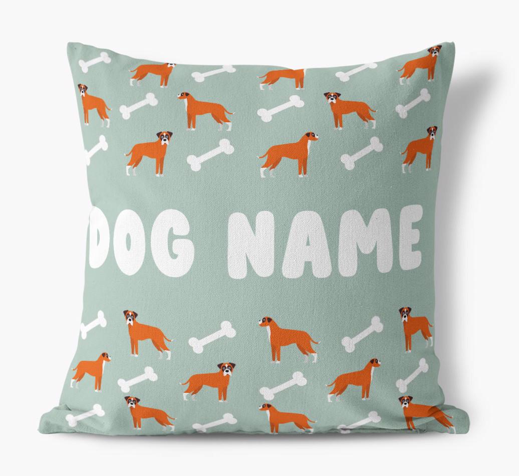 Personalized with Boxer’s name against a background of Boxer icons and bones, this gorgeous pillow is full of pawsonality.