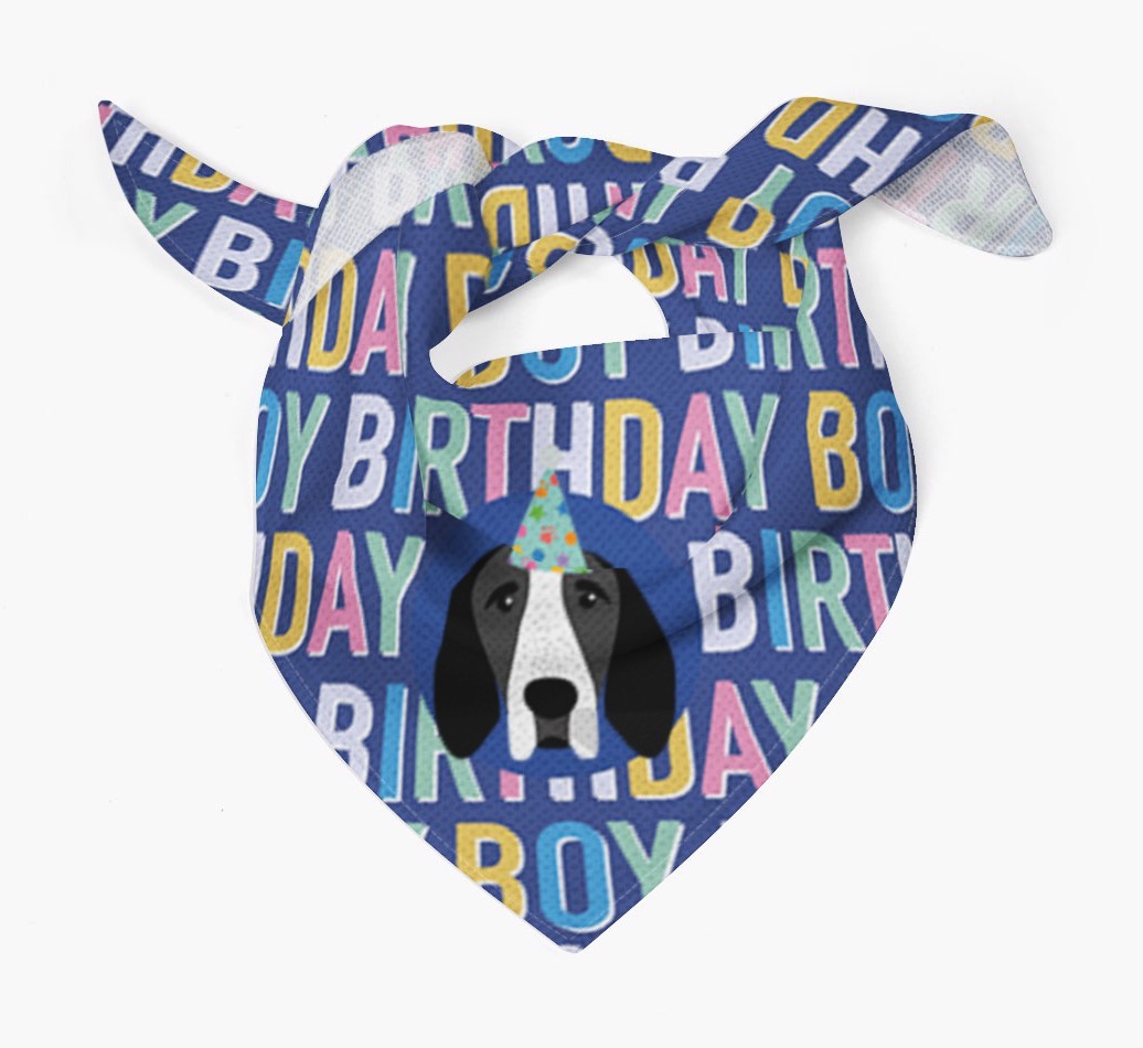 Featuring a colorful text pattern that reads 'birthay boy' and personalized with Braque D'Auvergne's cute icon (complete with a fun party hat), your Auvergne will look simply pawgeous on their special day when they're wearing this bandana.