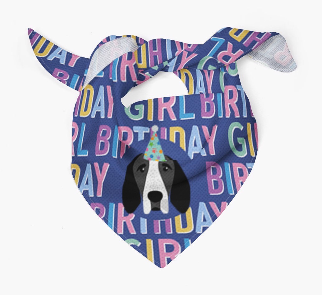 Featuring a text pattern that reads 'birthay girl' and personalized with Braque D'Auvergne's cute icon (complete with a fun party hat), your Auvergne will look simply pawgeous on their special day when they're wearing this bandana.