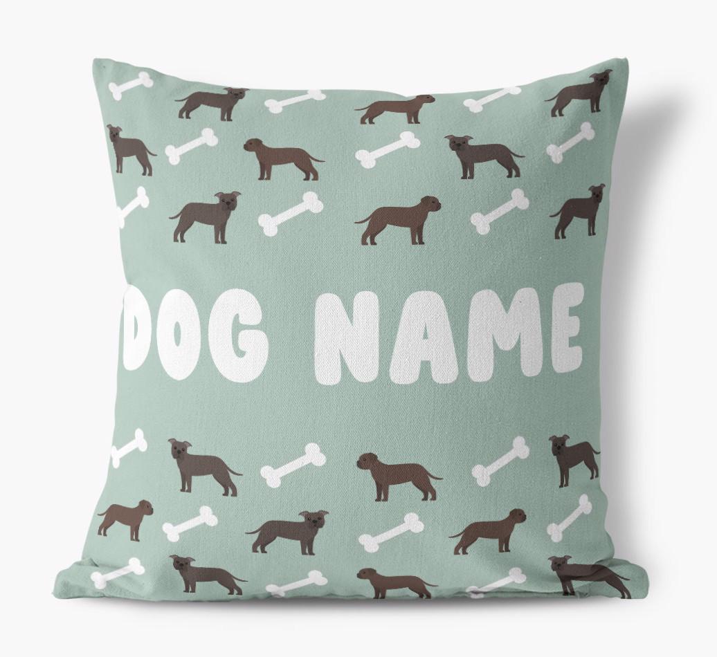Personalized with Bugg’s name against a background of Bugg icons and bones, this gorgeous pillow is full of pawsonality.