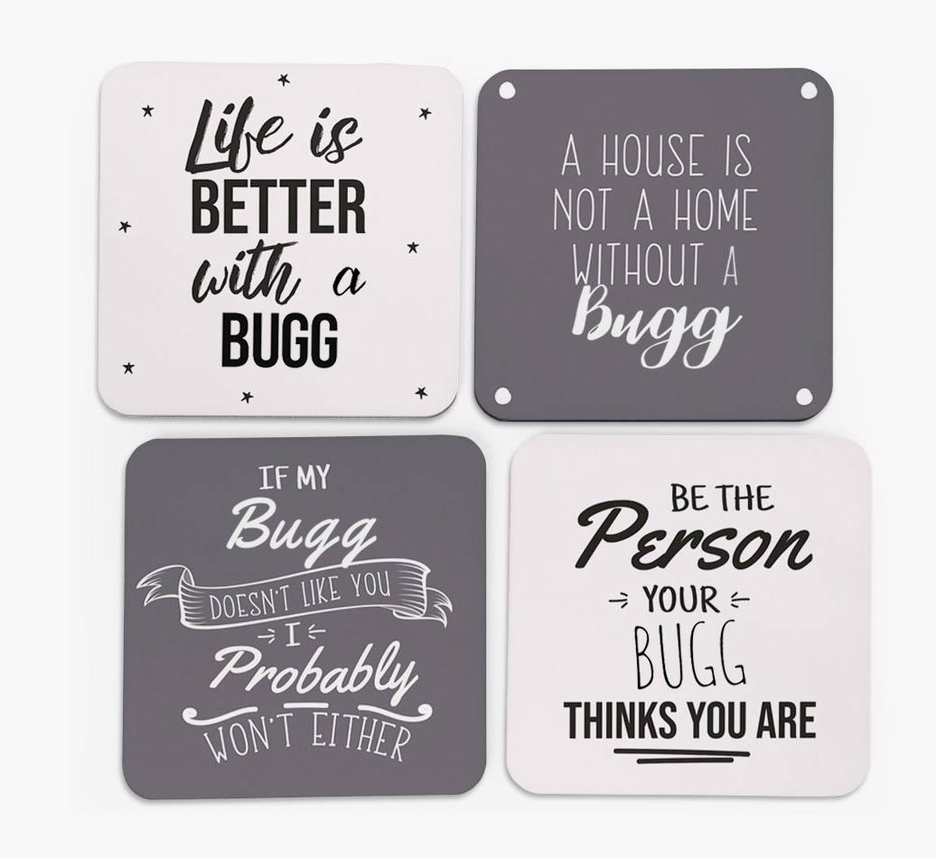 Each coaster has a special unique phrase and shows just how much Bugg means to you. They come in five contemporary colors and are the pawfect addition to any stylish Bugg lover's home.