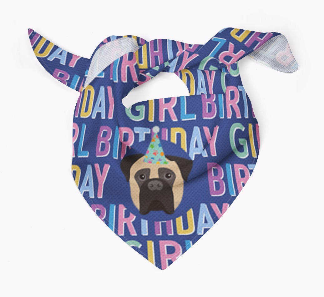 Featuring a text pattern that reads 'birthay girl' and personalized with Bullmastiff's cute icon (complete with a fun party hat), your Bullmastiff will look simply pawgeous on their special day when they're wearing this bandana.