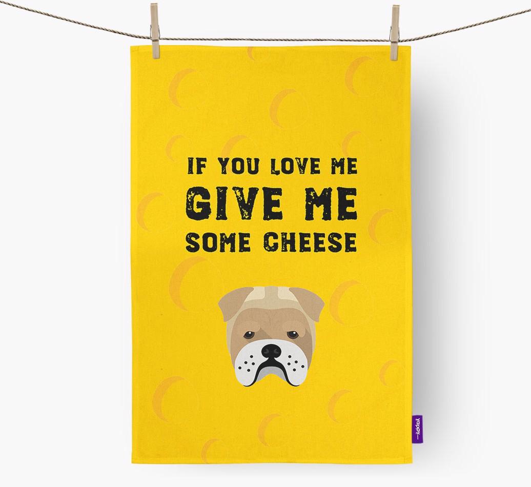 This exclusive Yappy dish towel features a pawsome Bull Pei icon upon a cheese themed background and Bull Pei's furvorite phrase ‘If you love me, give me some cheese’.