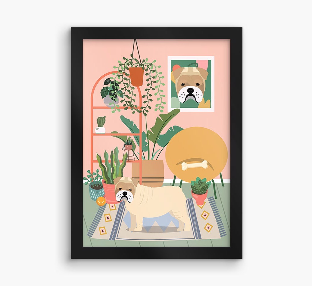 This contemporary piece of wall art pairs a chic living space with lovely pastel tones and a jungle of houseplants. Complete with the one that makes your house a home - Bull Pei! - this print is a wonderful way to display your love for your pooch.