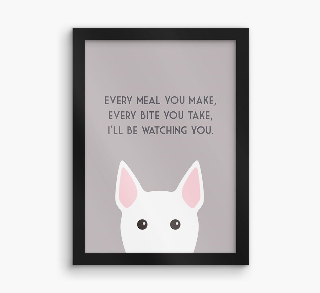 Printed with the words, ‘Every meal you make, every bite you take, I’ll be watching you’ and complete with our cute Bull Terrier peeking from the bottom of the design, this artwork will look great on display in the kitchen or anywhere Bull Terrier likes to watch you eat!