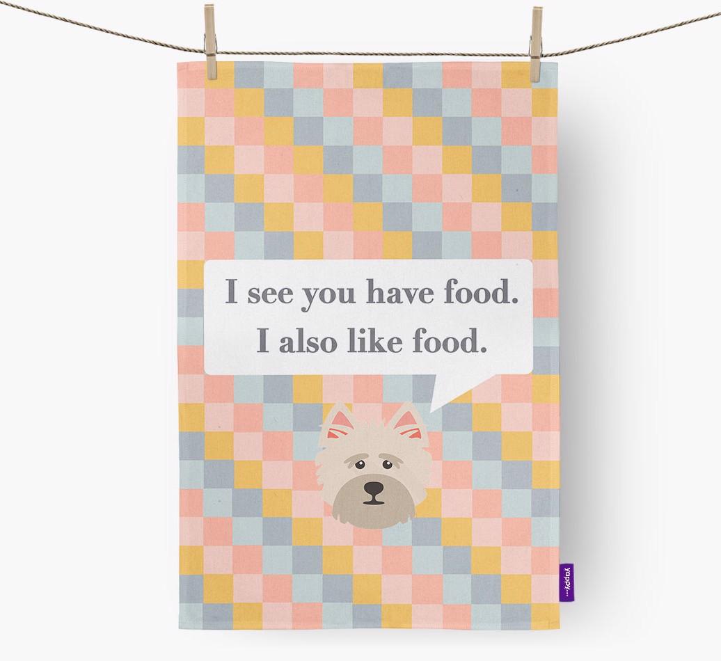 If your Cairn Terrier is a full time snack machine, this dish towel may be the ideal way to warn your guests.