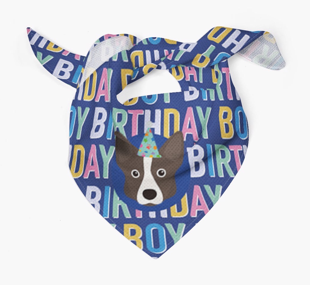 Featuring a colorful text pattern that reads 'birthay boy' and personalized with Cardigan Welsh Corgi's cute icon (complete with a fun party hat), your Corgi will look simply pawgeous on their special day when they're wearing this bandana.