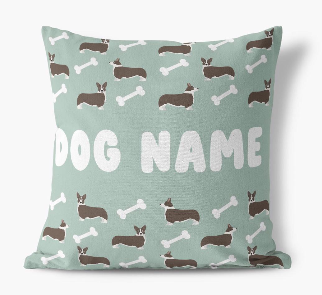 Personalized with Cardigan Welsh Corgi’s name against a background of Corgi icons and bones, this gorgeous pillow is full of pawsonality.