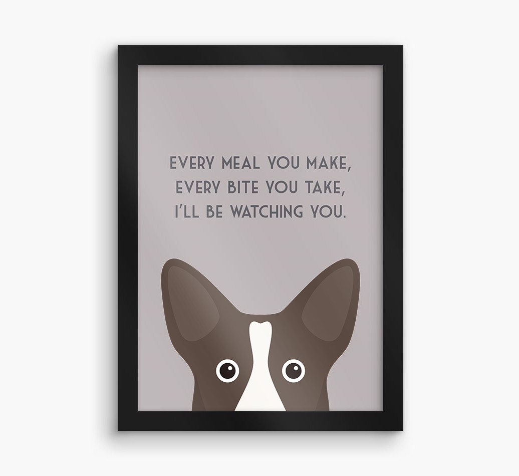 Printed with the words, ‘Every meal you make, every bite you take, I’ll be watching you’ and complete with our cute Corgi peeking from the bottom of the design, this artwork will look great on display in the kitchen or anywhere Cardigan Welsh Corgi likes to watch you eat!