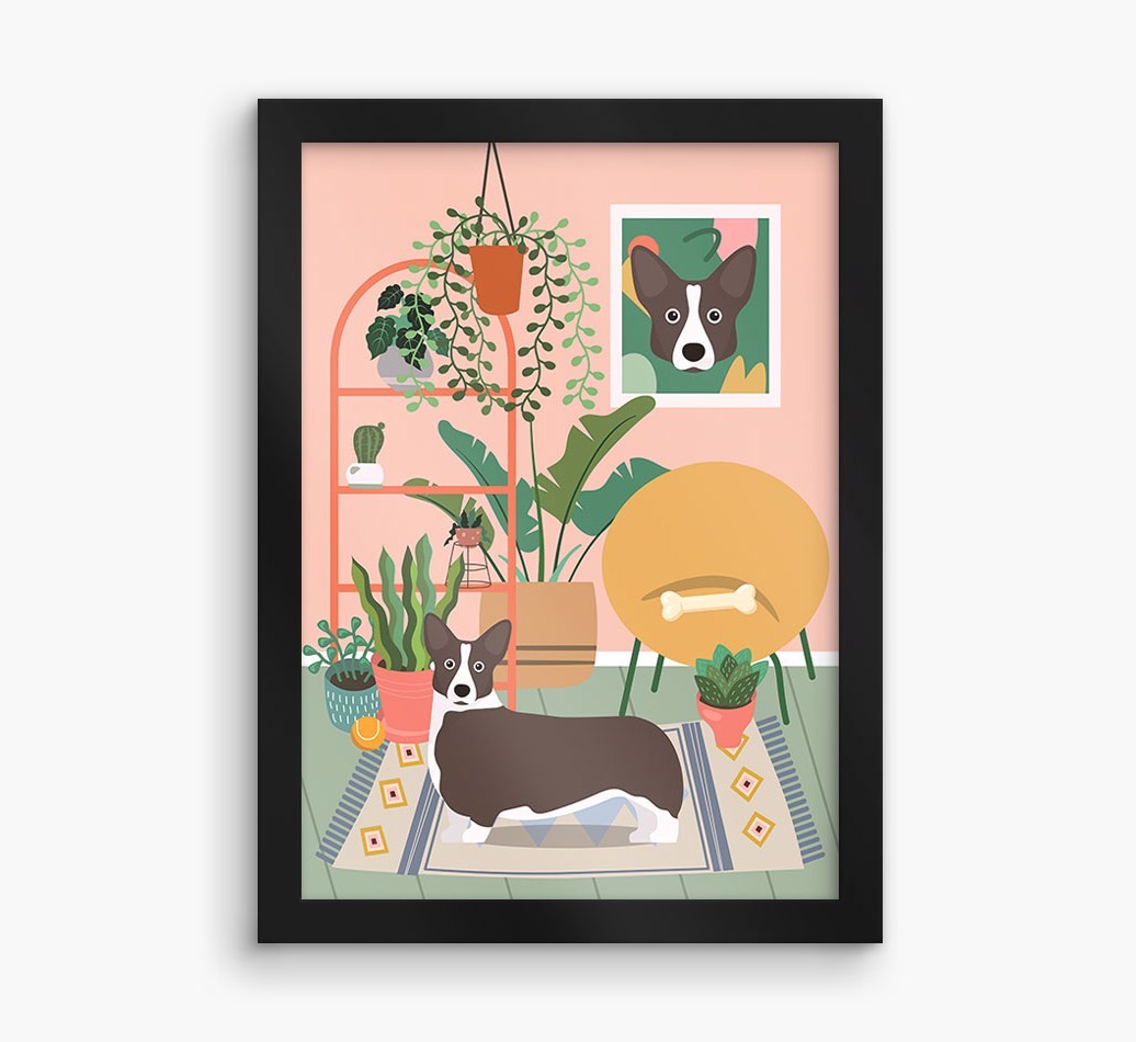This contemporary piece of wall art pairs a chic living space with lovely pastel tones and a jungle of houseplants. Complete with the one that makes your house a home - Cardigan Welsh Corgi! - this print is a wonderful way to display your love for your pooch.