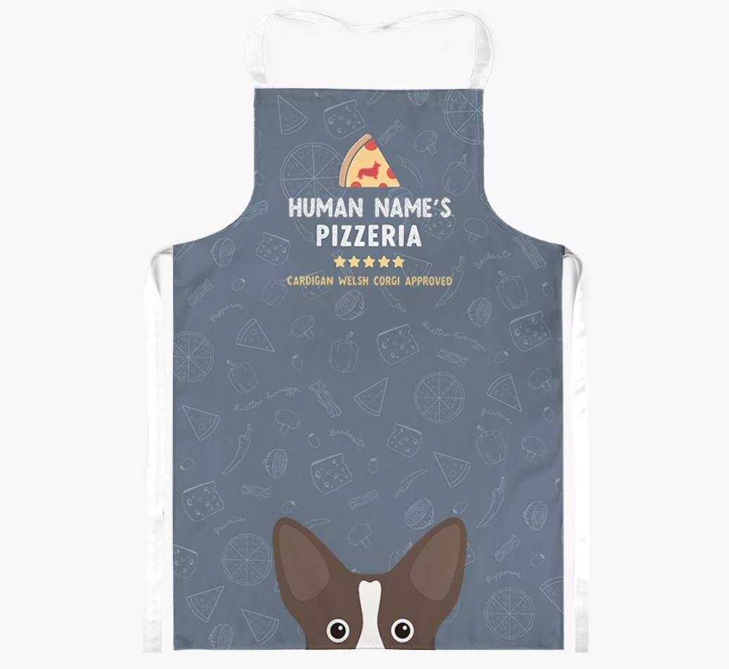 Featuring your furry friend's icon and lick of approval, plus your chosen human name, this apron is pawfect for anyone who considers themselves a pizza maestro in the kitchen. Available in a choice of 5 rustic colors, it'll make any Corgi lover happy.