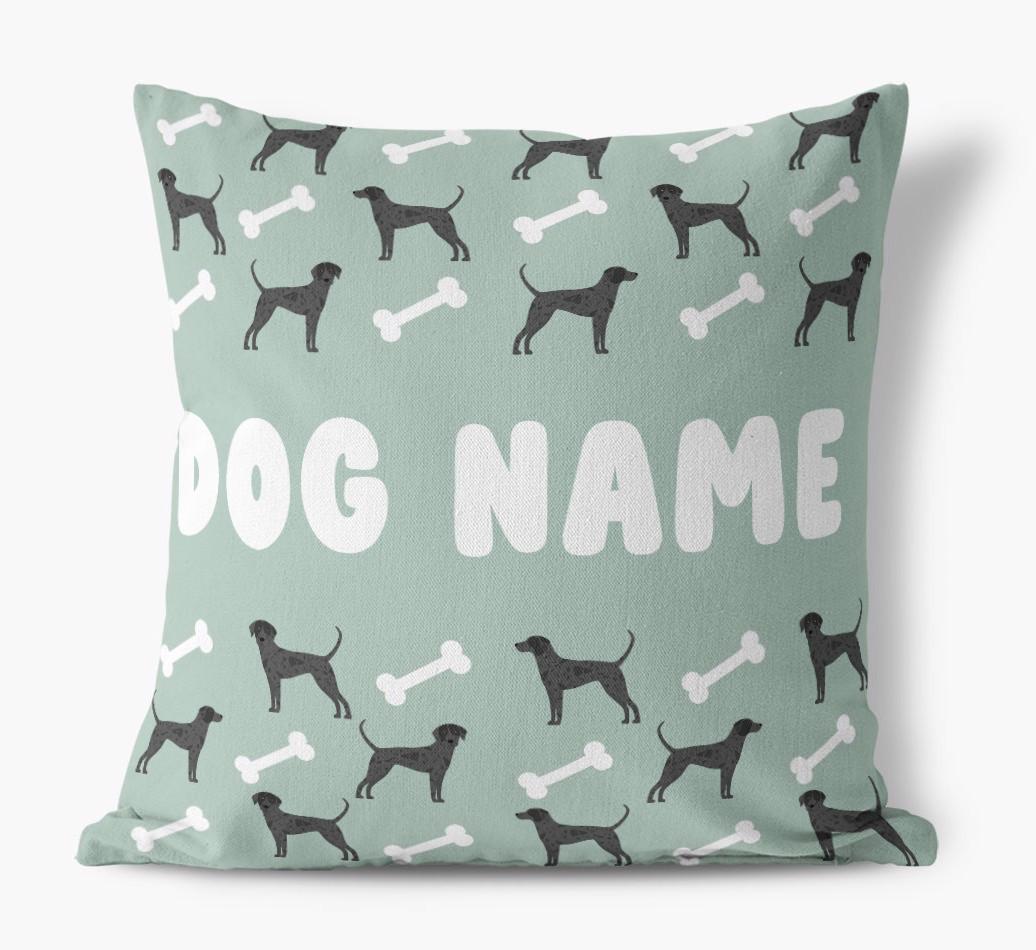 Personalized with Catahoula Leopard Dog’s name against a background of Leopard Dog icons and bones, this gorgeous pillow is full of pawsonality.
