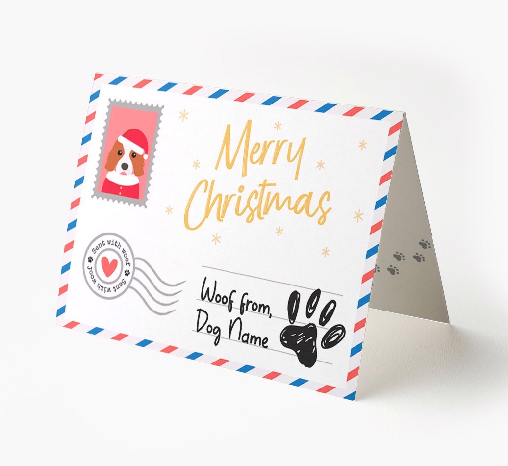 Featuring a fun postcard design, the front of the card is signed with Cavalier King Charles Spaniel's name, plus it's complete with an extra special Christmas stamp - your Cavalier's festive icon! These cute custom features are sure to delight your friends and family.