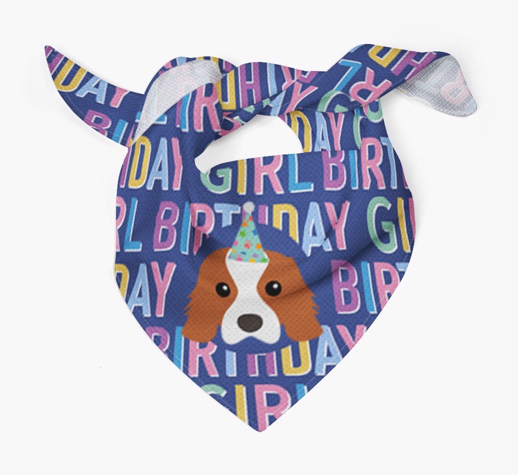 Featuring a text pattern that reads 'birthay girl' and personalized with Cavalier King Charles Spaniel's cute icon (complete with a fun party hat), your Cavalier will look simply pawgeous on their special day when they're wearing this bandana.