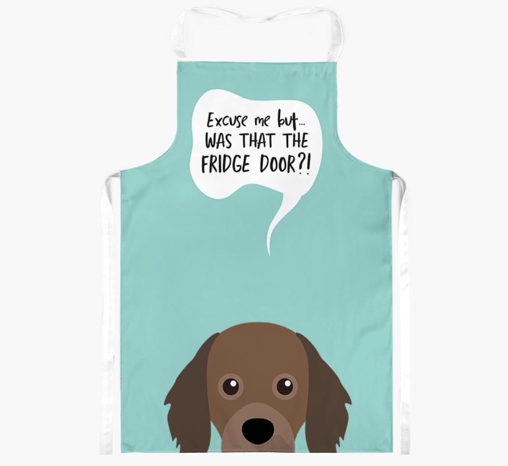 Featuring your hungry hound's cheeky icon and available in five eye-catching colors, this apron is a must-have for parents of greedy pups!