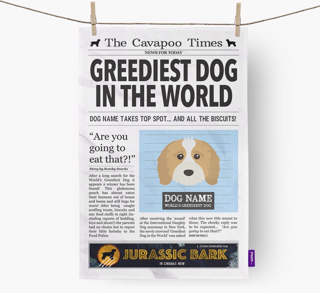 This unique dish towel puts Cavapoo truly in the spotlight (as if they weren’t already). It features a Yappy exclusive Cavapoo mug shot icon as well as two smaller Cavapoo silhouettes.
