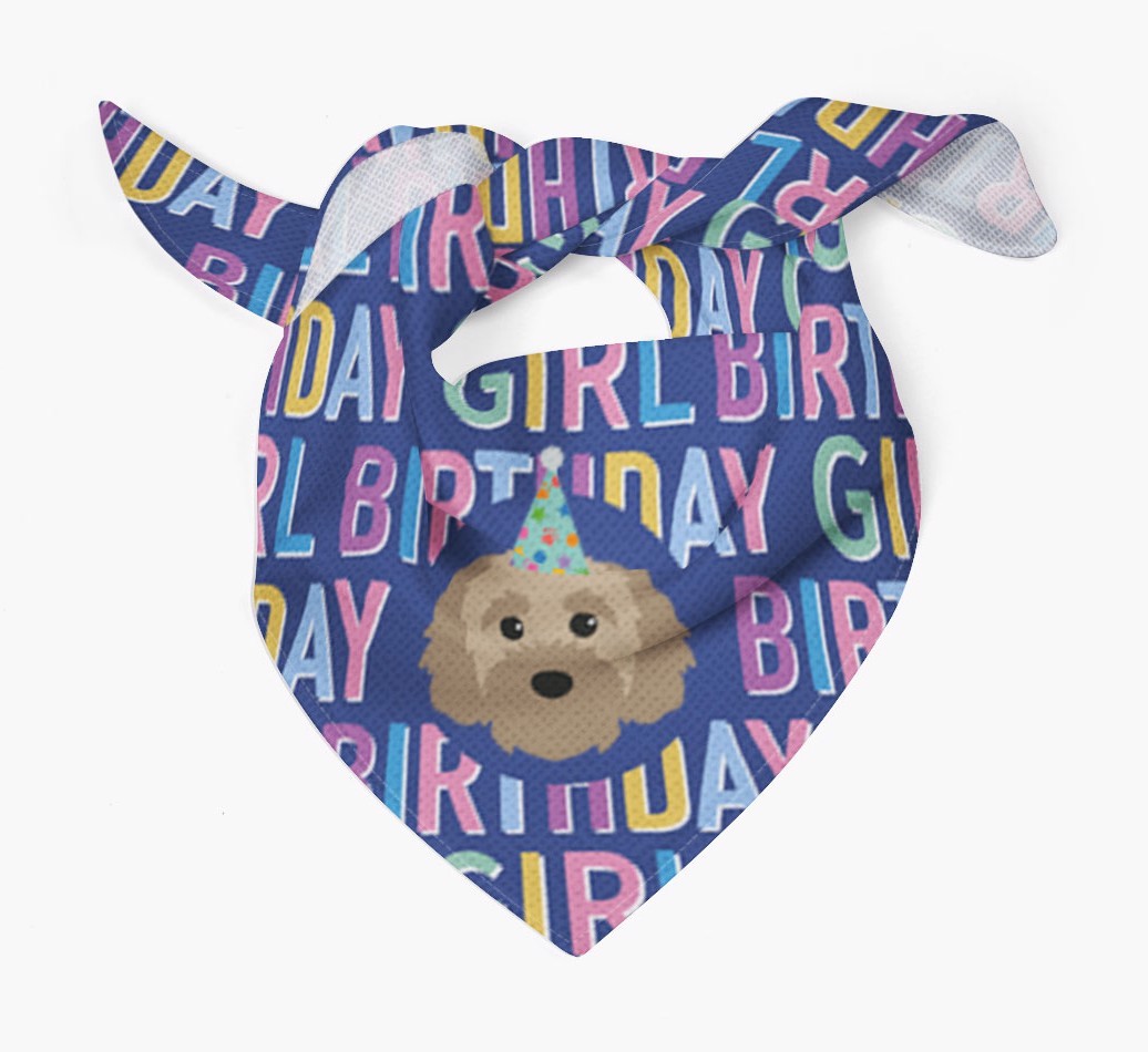 Featuring a text pattern that reads 'birthay girl' and personalized with Cavapoochon's cute icon (complete with a fun party hat), your Cavapoochon will look simply pawgeous on their special day when they're wearing this bandana.