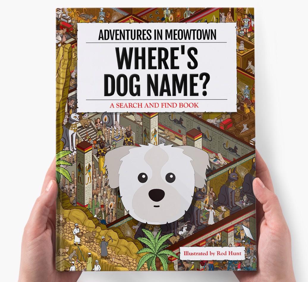 Get ready to unleash your inner detective with our popular Search & Find book, ‘Where’s (insert dog name)?’ It’s the personalized dog book everyone’s yapping about! With twelve beautifully illustrated locations to explore, we challenge you to find your adventurous {breedShortName} on each action-packed page. Can you spot all the canine cameos and funny parodies too?