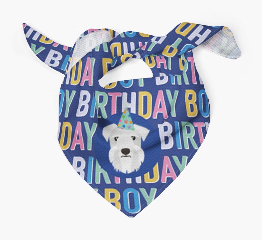 Featuring a colorful text pattern that reads 'birthay boy' and personalized with Cesky Terrier's cute icon (complete with a fun party hat), your Cesky Terrier will look simply pawgeous on their special day when they're wearing this bandana.