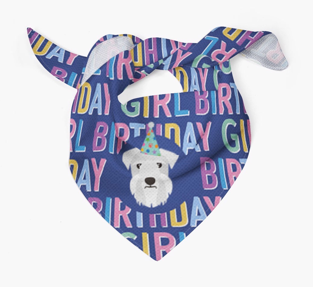 Featuring a text pattern that reads 'birthay girl' and personalized with Cesky Terrier's cute icon (complete with a fun party hat), your Cesky Terrier will look simply pawgeous on their special day when they're wearing this bandana.