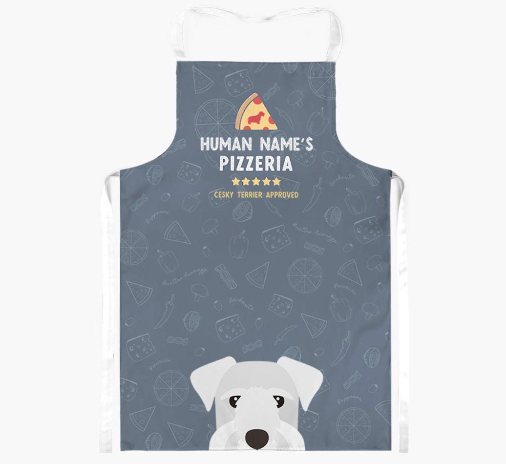 Featuring your furry friend's icon and lick of approval, plus your chosen human name, this apron is pawfect for anyone who considers themselves a pizza maestro in the kitchen. Available in a choice of 5 rustic colors, it'll make any Cesky Terrier lover happy.