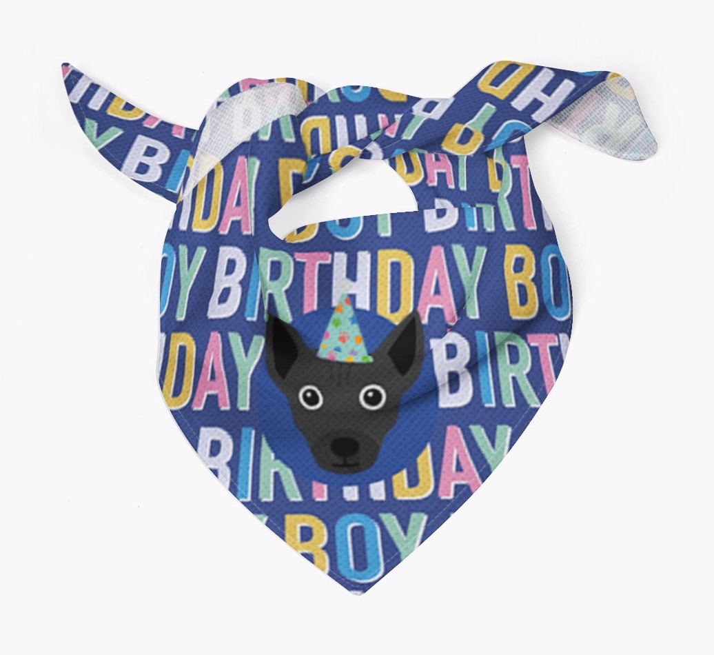 Featuring a colorful text pattern that reads 'birthay boy' and personalized with Chi Staffy Bull's cute icon (complete with a fun party hat), your Chi Staffy Bull will look simply pawgeous on their special day when they're wearing this bandana.
