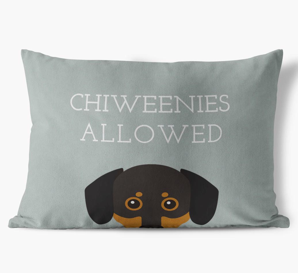 This exclusive, luxurious pillow is printed with the words ‘Chiweenies Allowed’, which I’m sure Your Chiweenie would definitely approve of.
