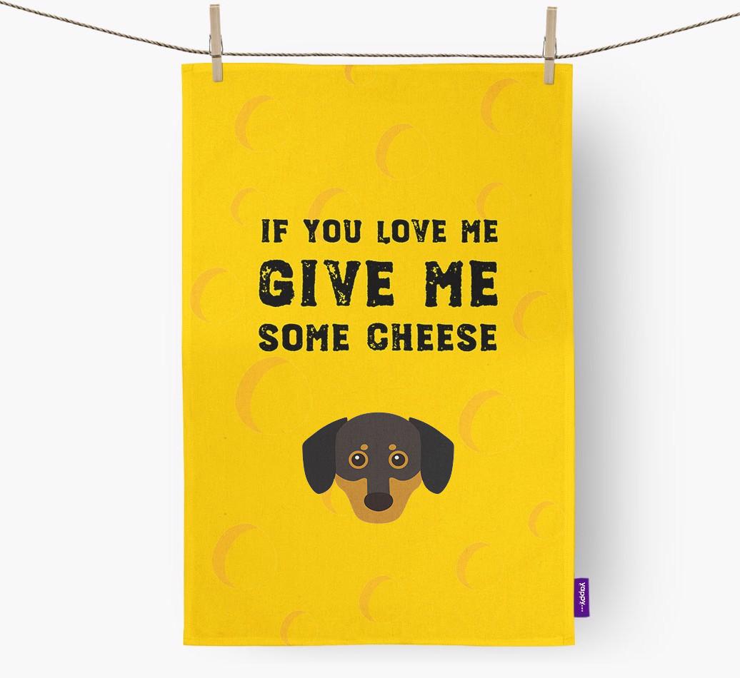 This exclusive Yappy dish towel features a pawsome Chiweenie icon upon a cheese themed background and Chiweenie's furvorite phrase ‘If you love me, give me some cheese’.