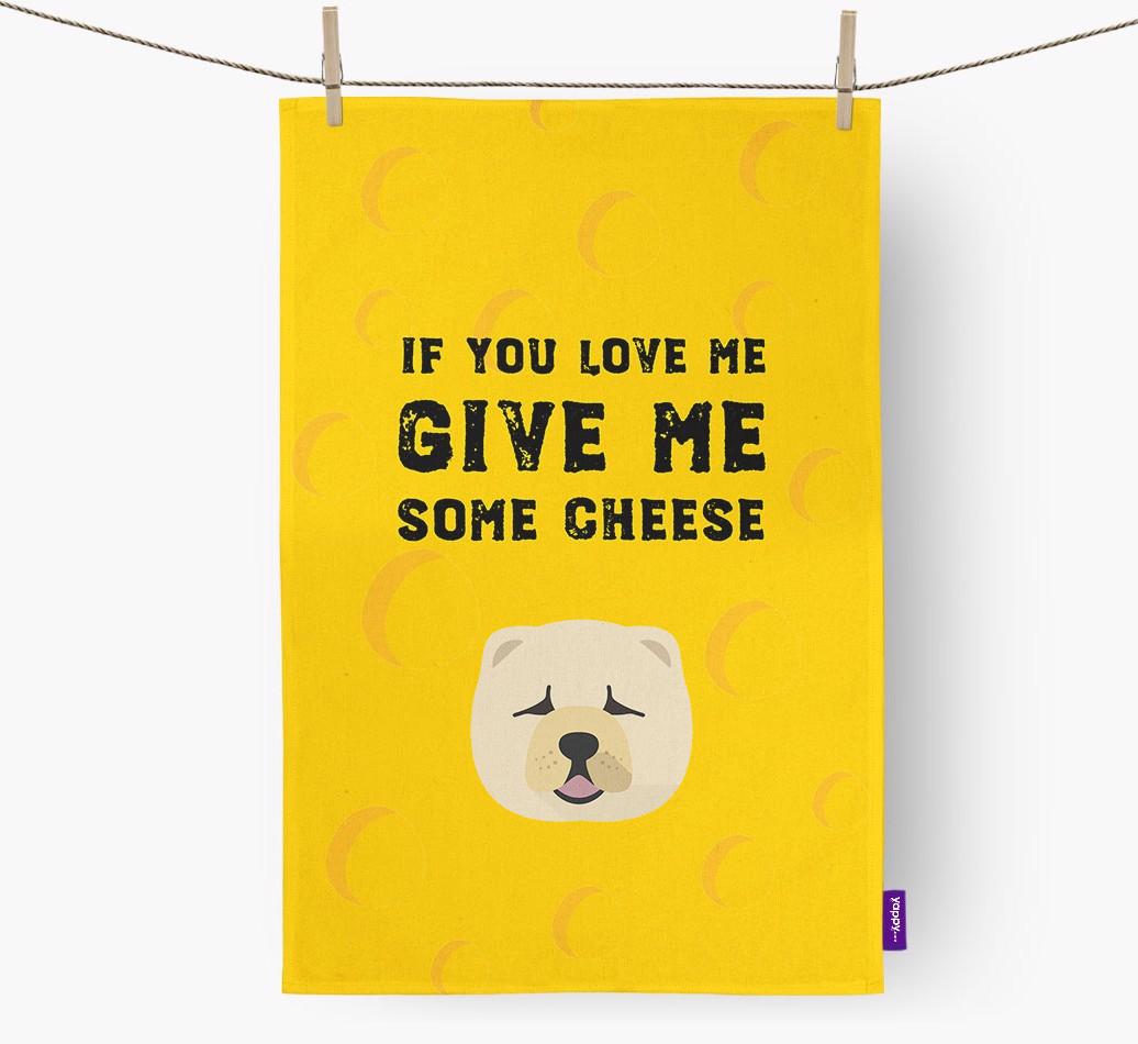 This exclusive Yappy dish towel features a pawsome Chow Chow icon upon a cheese themed background and Chow Chow's furvorite phrase ‘If you love me, give me some cheese’.