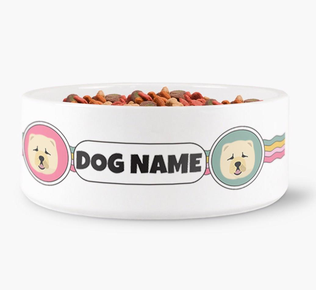 This jazzy dog bowl is sure to make waves with Chow Chow! With a colorful wavy pattern, this bowl is personalized with adorable Chow Chow icons and Chow Chow’s name to make it extra special.