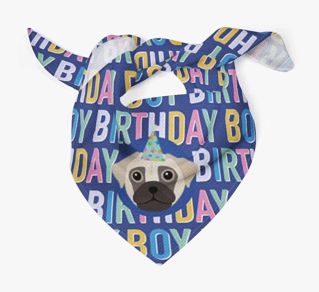 Featuring a colorful text pattern that reads 'birthay boy' and personalized with Chug's cute icon (complete with a fun party hat), your Chug will look simply pawgeous on their special day when they're wearing this bandana.