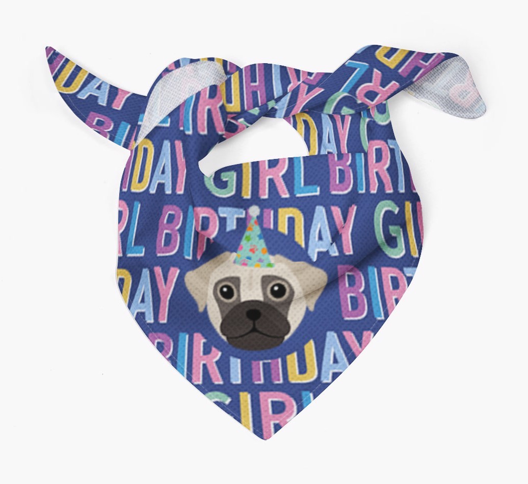 Featuring a text pattern that reads 'birthay girl' and personalized with Chug's cute icon (complete with a fun party hat), your Chug will look simply pawgeous on their special day when they're wearing this bandana.