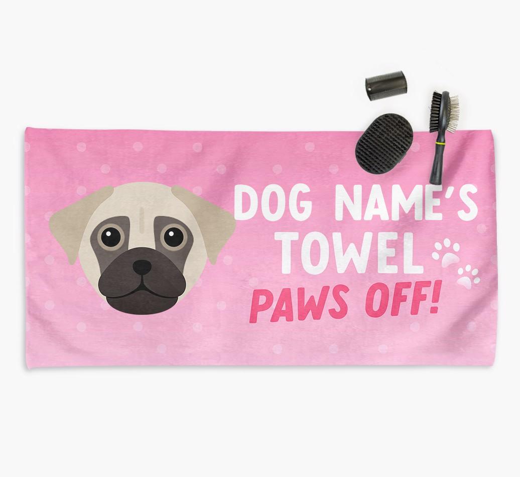 Perfect for messy pups and for pampering your Chug at bathtime, this soft and absorbent towel is made for cleaning your mucky pup and drying them off in a flash. It's personalized with Chug's name and icon and is printed with a message for everyone else to keep their paws off it!