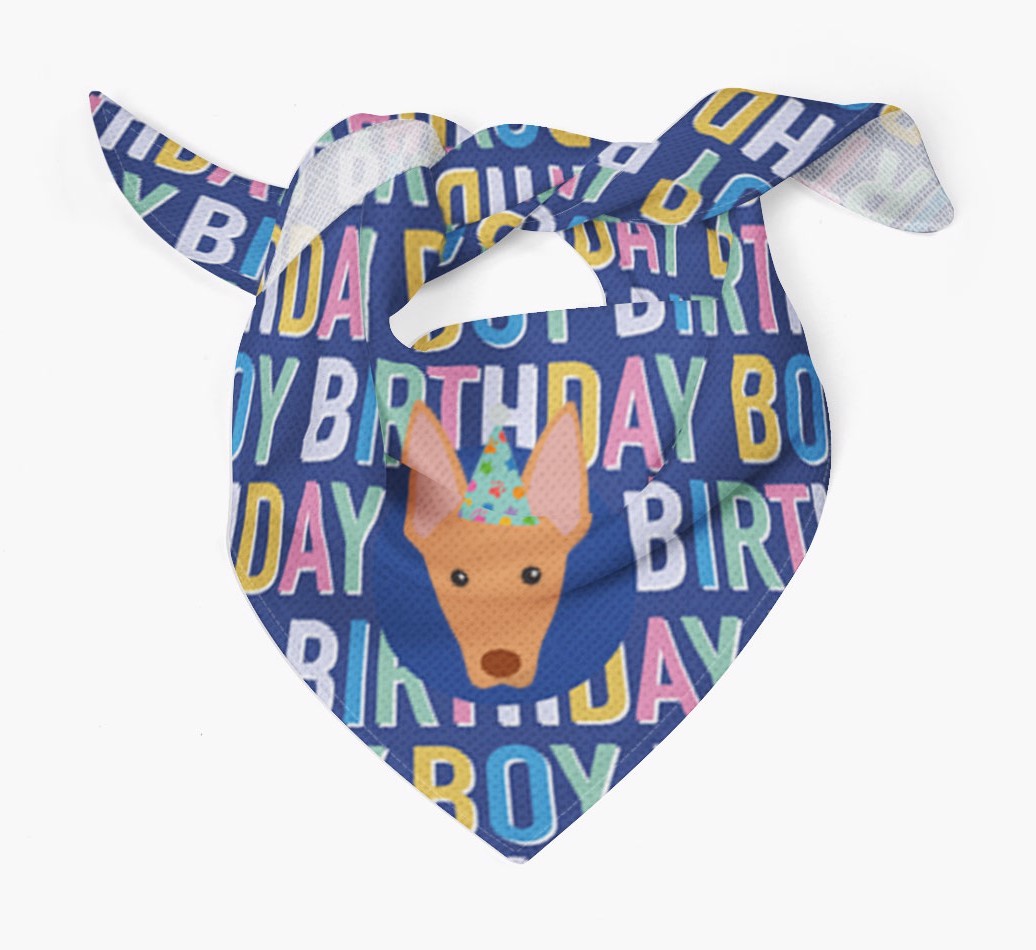 Featuring a colorful text pattern that reads 'birthay boy' and personalized with Cirneco Dell'Etna's cute icon (complete with a fun party hat), your Cirneco will look simply pawgeous on their special day when they're wearing this bandana.