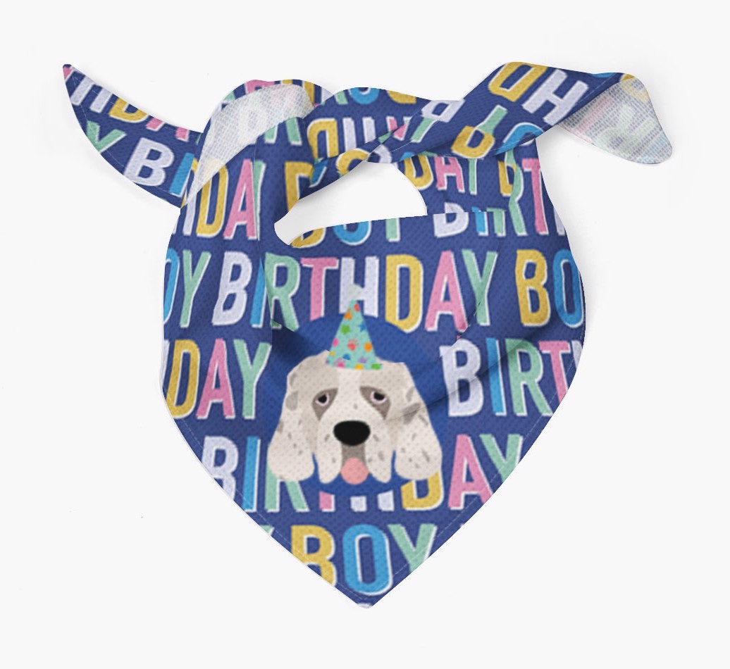 Featuring a colorful text pattern that reads 'birthay boy' and personalized with Clumber Spaniel's cute icon (complete with a fun party hat), your Spaniel will look simply pawgeous on their special day when they're wearing this bandana.