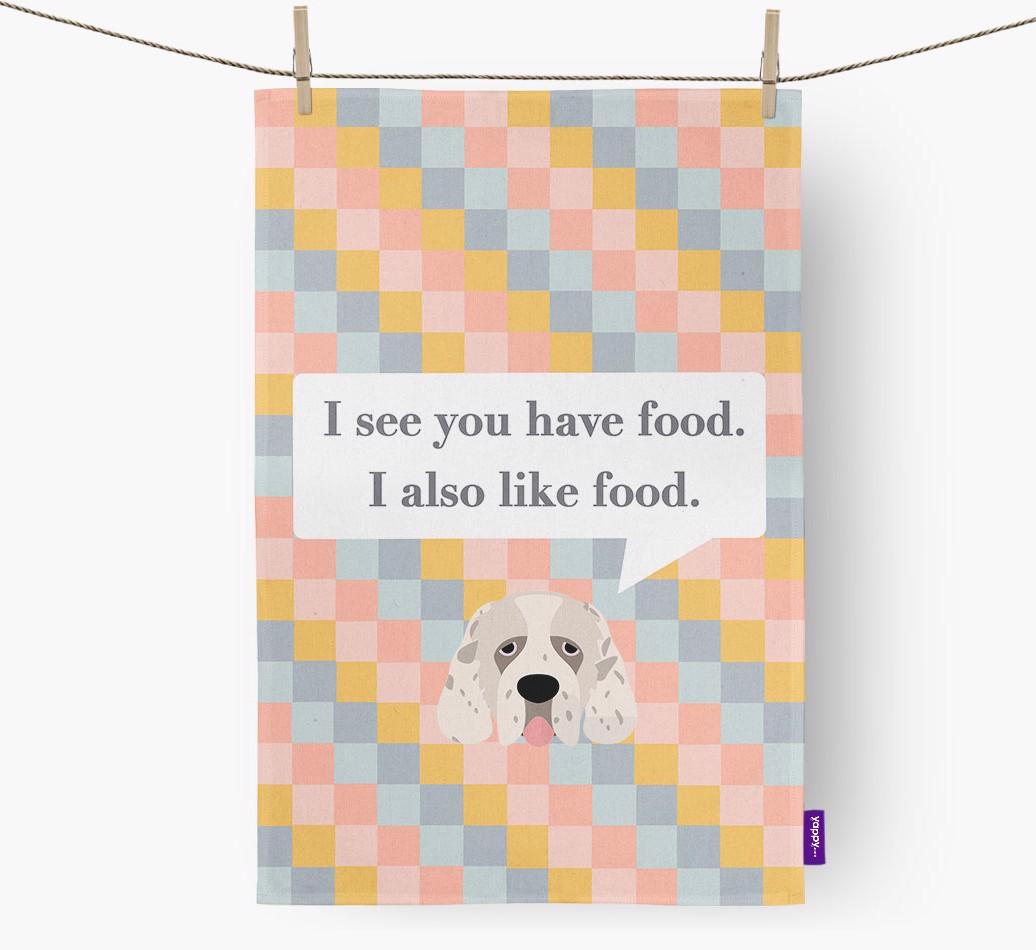 If your Clumber Spaniel is a full time snack machine, this dish towel may be the ideal way to warn your guests.