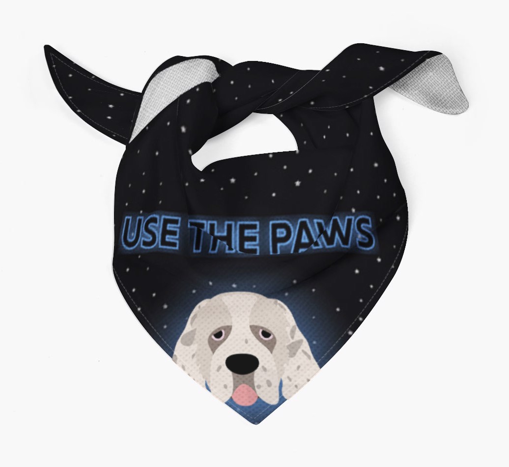 Featuring a starry night sky and glowing text, this bandana is made extra special with the addition of your Spaniel's cute icon.